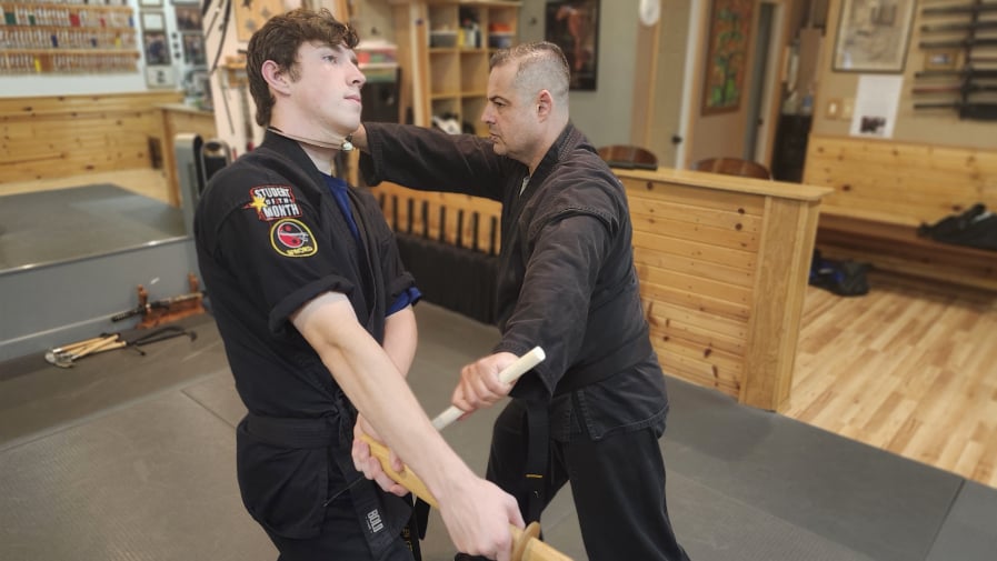 Sensei Norcross shows a Wednesday night Budo class how to disassemble and clean samurai swords.